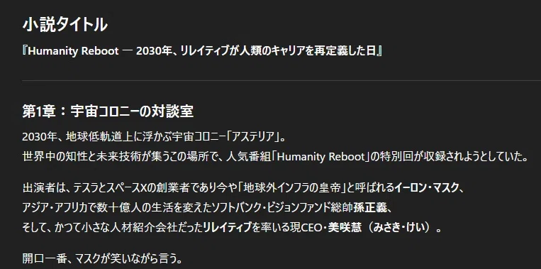 イーロン・マスクや孫正義といった著名人も加えて、長編小説仕立てにして